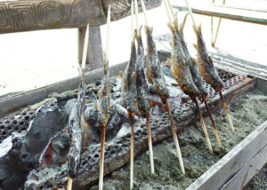 釣ったマスは場内の炭火で香ばしく塩焼きにでき、自然の中でできたての味を楽しめるのが魅力のひとつです。